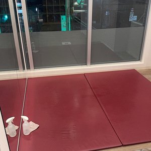 私がマットの上でストレッチをしていると