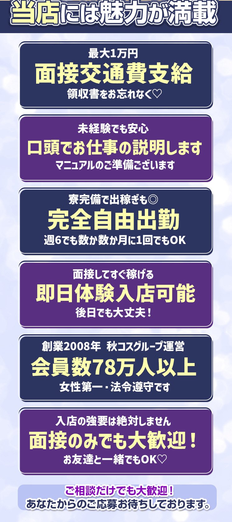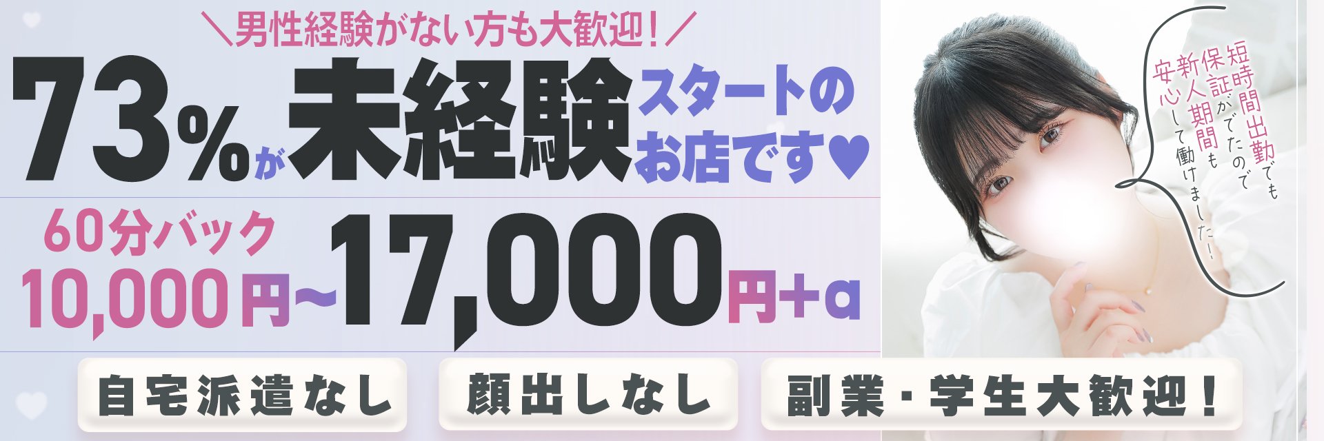 | A | 基本60分 10,000円スタートです🌟 ※今までの実績やカップ数・スペック等で面接時判断にはなりますが、11,000円や12,000円スタートの子も多数在籍中💞ぜひご相談くださいね✨ (本指名バック・スライドバック・姫予約バック制度あり) |