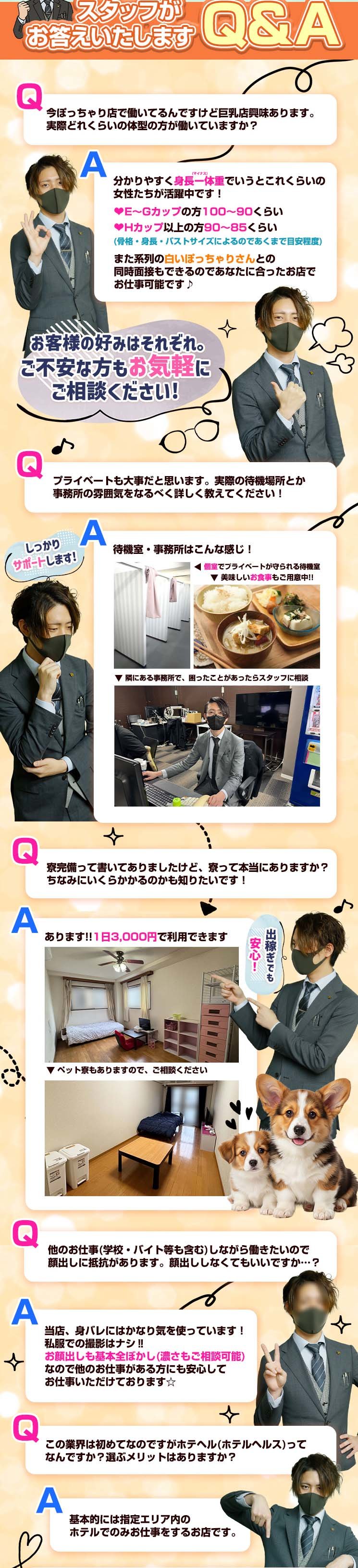 | A | 全然大丈夫です🙆お店の営業ページをご覧いただくとお分かりになると思いますが、顔出ししている方の方が少ないです! それでも皆さんしっかり稼いでらっしゃいます✨ |