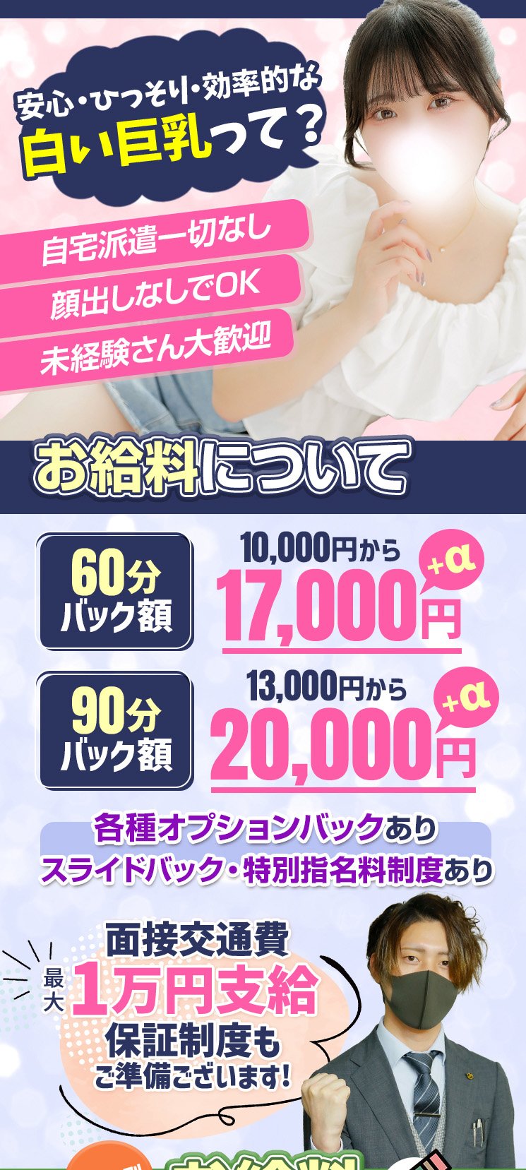 🤍全員保証・自宅派遣一切ナシ🤍Eカップ以上なら効率的に日給5万円以上可能🤍
