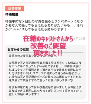 今回は在籍の女の子からお店への改善点のご要望を頂きました(__)