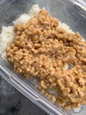 タッパーにご飯だけ詰めて、納豆で済ます荒業です。