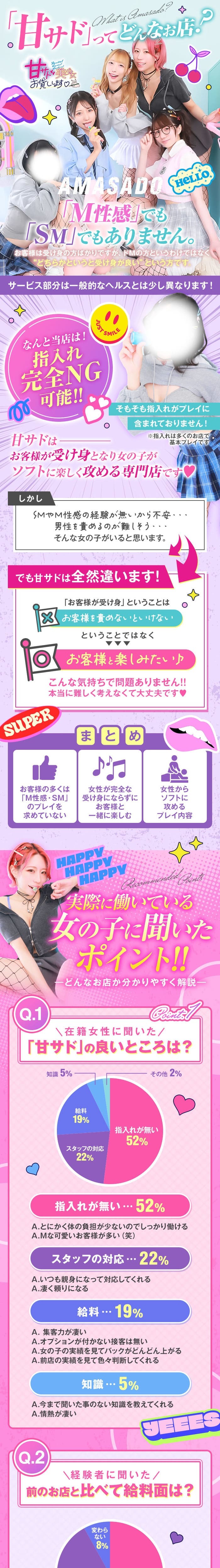 | A | 「男性が受け身」という事は ×男性を責めなくてはいけない ×技術やテクニックを身に付けて満足させなくてはいけない ではなくて、こう考えてはいかがでしょう? ○男性と気持ちいい事したい 技術や知識が必要なお店は、もっと専門的な店舗様でございます。 お客様も本格的なからはそちらを選びます。 「甘サド」の意味するところはプレイ内容というよりは、女性が積極的に仕掛けていく「態度」のようなものでございます! |