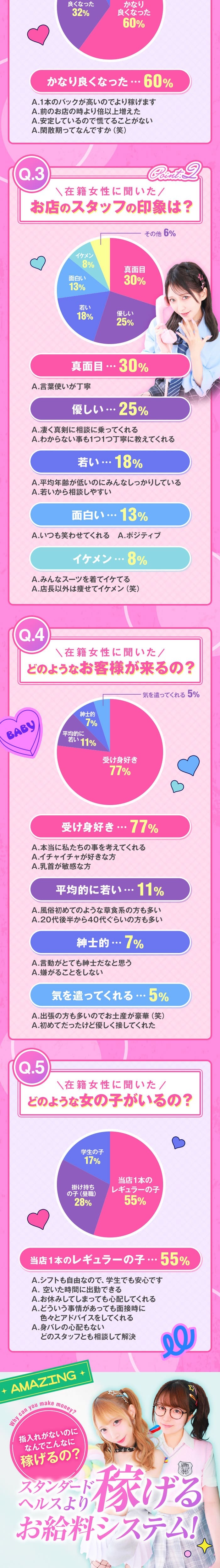 | A | ・学校帰りの学生の方 ・本業が終わった後~終電までの社会人の方 ・別のお店(風俗・飲み屋さん)と掛け持ちの方 (体の負担が軽いので、これが可能です!) ・企業されてる方 ・モデルやイベンターの方が空き時間に ・”責め”がシンプルに好きな方 背景は様々ですが、”自分らしく””楽しく”お仕事していただいております! |