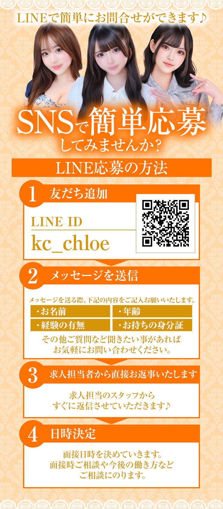 | A | 少しでも当店に興味を持っていただけましたら、まずは体験入店してみましょう♪お店の雰囲気や、お客様の層、スタッフの対応などを実感してみてください^^ Chloeでは女の子の働きやすさを第一に取り組んでおります!! お仕事していただくお店の環境やお給料面、お客様の質、スタッフの教育etc…様々な角度から改善と挑戦を繰り返してきました!! ぜひ体入からお待ちしております♪ |