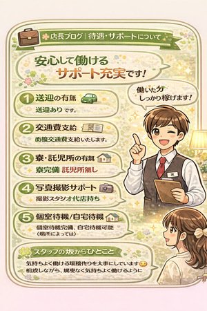| 🍀 待遇・サポートについて(働きやすさ重視) こんにちは、スタッフ坂です😊 今日は「待遇・サポートって実際どうなの?」という質問が多いので、 当店のサポート体制をわかりやすくまとめます。 はじめての方も安心できるように、なるべく正直に書きますね。 |