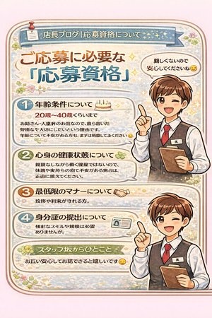 | 📌 応募資格について(必ず確認してください) こんにちは、スタッフ坂です😊 今日は「応募資格」についてお話しします。 ここはお互いに安心するための大事な部分なので、正直に書きますね。 |