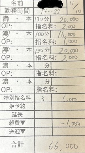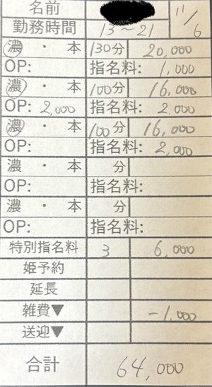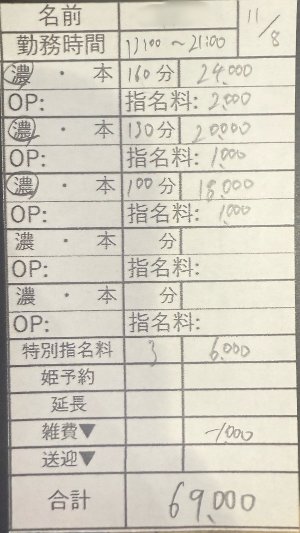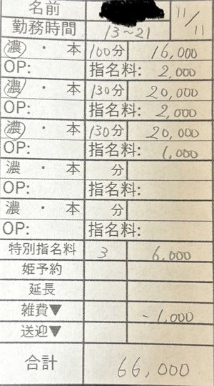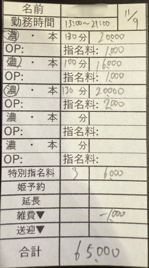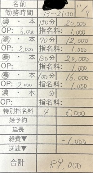 特別指名料を除いても6万なのでまぁ8時間勤務でこれならキャストとしても許容範囲でしょう