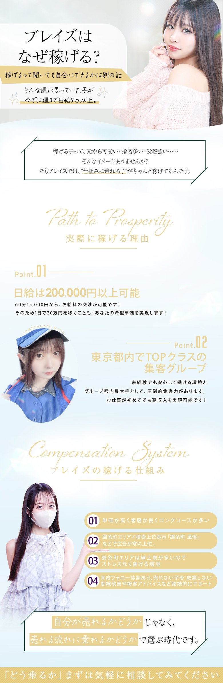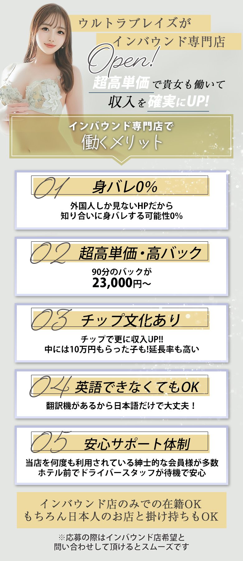 「やってみたいけど勇気が出ない…」そんなあなたを全力で応援します!入店してくれた方全員に【入店祝い金10万円】支給♪全員が対象だから、初日から安心して働けます。経験やブランクは問いません。あなたの新しいスタートを一緒に作りましょう!
