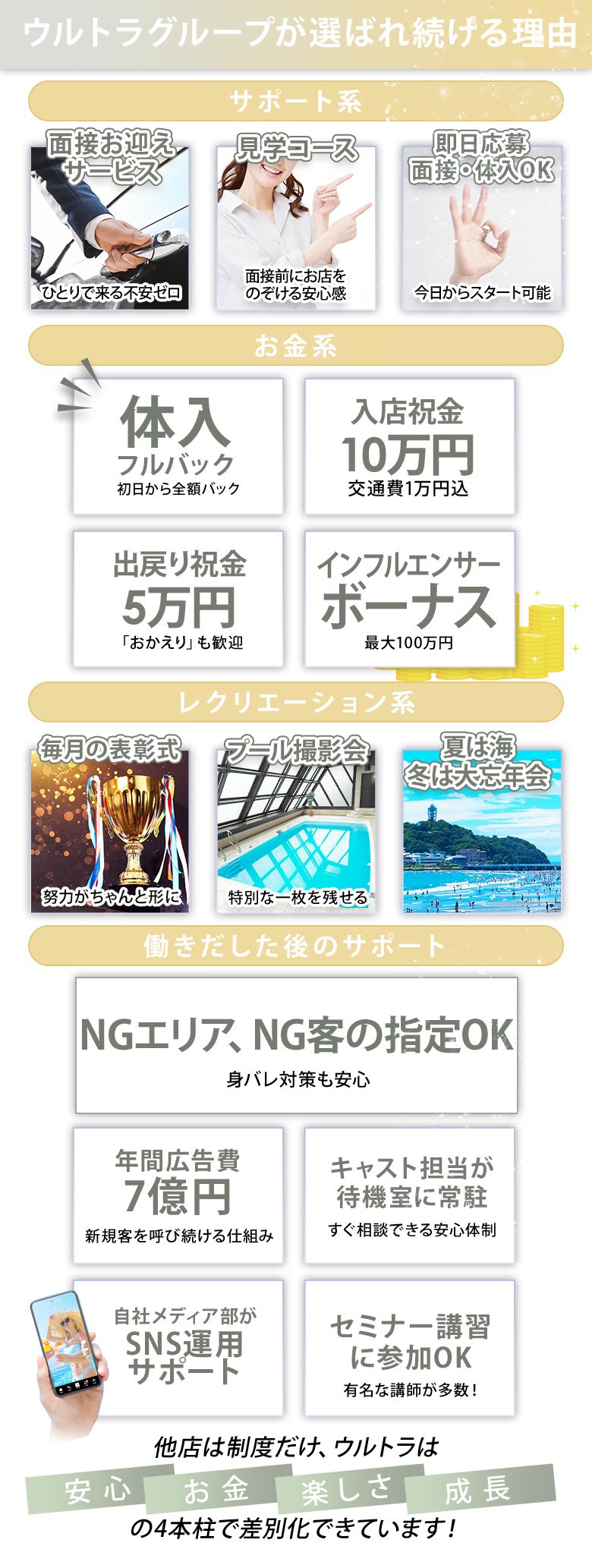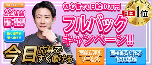 | A | 当店は完璧なサポート体制で 女の子をバックアップ! ウルトラグループで実際に働いている ランキング入りしている女の子の中にも 未経験からスタートの子も多いです。 業界最大規模のウルトラグループが 女の子を全力でバックアップ! スタッフが丁寧に教えていきますので お気軽にお問い合わせ下さい(^^) |