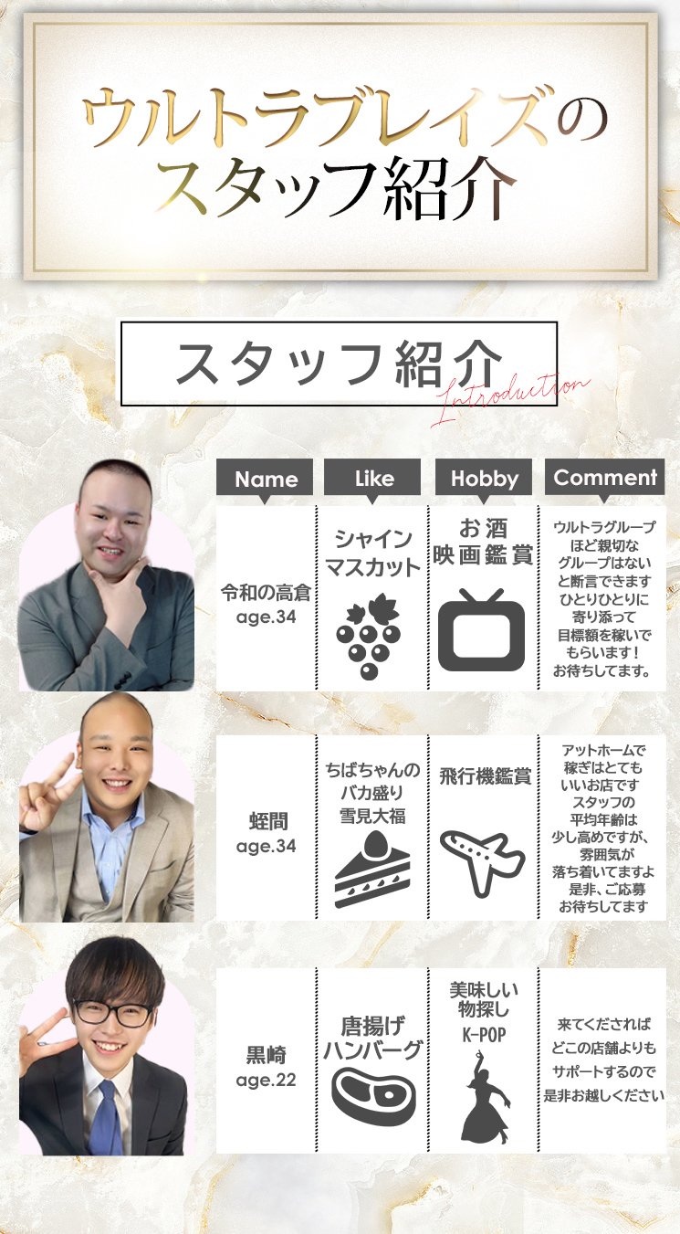 | A | お客様の年齢層は40代~。サラリーマンや、中小企業を経営されてる方など社会的にも信用性があり金銭面でも安定されたお客様が多いのもウルトラブレイズの特徴です。 勿論、お店としても働く女の子達にそう思って頂けるよう、お客様のルール違反に関しては出入り禁止対応、来店時にお酒が入り過ぎてるお客様などはお断り、ご案内前には禁止事項の確認などお客様管理を徹底しております。 |