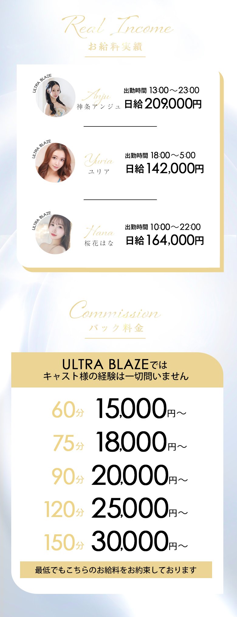 【出勤時間】20:00~04:00【月収】150万円以上【平均日給】150,000円【月出勤数】10日【働き方について】私は昼間に本業があり、出勤自体がそんなに多く出せませんが本指名様もいたり、出勤したら当日予約などで新規のお客様を紹介してくれたりと兼業でもハンデなくお仕事ができ、稼げてます。