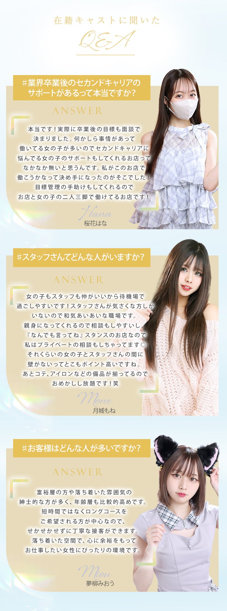 | A | 20代前半から40代で明るくて楽しい人が多いです。 稼げるために親身になって全力でサポートしてくれます。 |