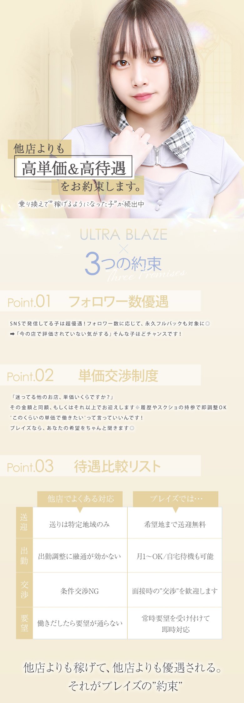 即日体験入店OK🎀一切嘘無し!本当に全員貰える入店祝い金10万円💖👑他のお店の条件を教えて下さい・それ以上を約束します👑 金額・条件・働きやすさ、すべてにおいて他店よりも好条件を約束します。 他店NG案件も、うちは“即OK”。待遇カスタム制度を取り入れます。 まずはご相談ください。