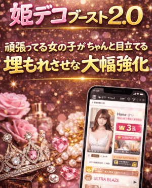 ヒメデコブースト2.0は、簡単に言えば、女の子の魅力を今まで以上に伝わりやすくし、 見てもらえるきっかけを増やしていくための機能です。