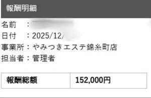 入店歴3ヶ月未満 1日のお給料約3万円~5万円出勤時間/日約6時間出勤日数/月約8日