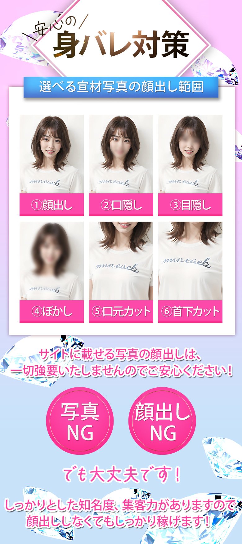 | A | 身バレを気にする方の方が多いですが、 『メディアに露出OKの方も大歓迎です』 新聞・雑誌・WEBサイト・youtube、TV等の取材は沢山あります。 います。 |