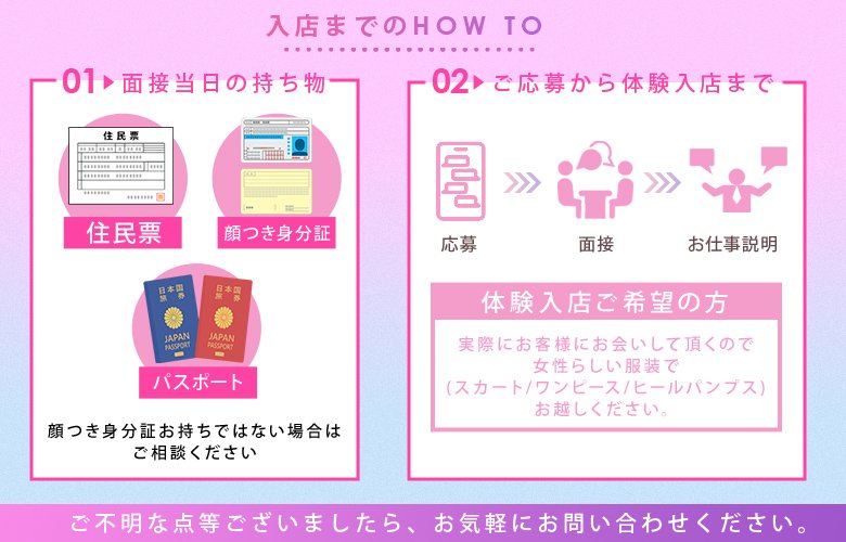 | A | もちろん採用後体験入店可能です!(顔写真付きの身分証が必ず必須になります) |