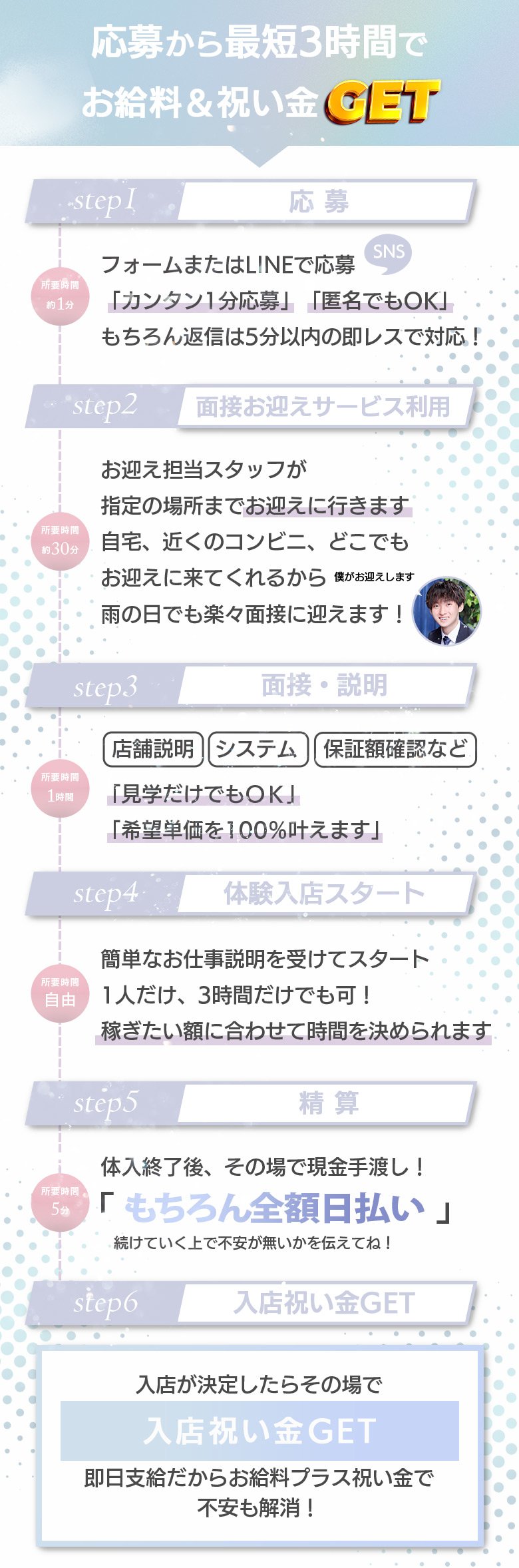 「辞めちゃった手前、戻りづらい…」「久しぶりで不安…」そんな気持ちも全部大丈夫!私たちは“もう一度頑張りたい”を全力で応援します。1度でも当店で働いた事がある方なら【再スタート応援金5万円】支給♪復帰初日から支給!環境もスタッフもあの頃よりもっと働きやすくなっています!