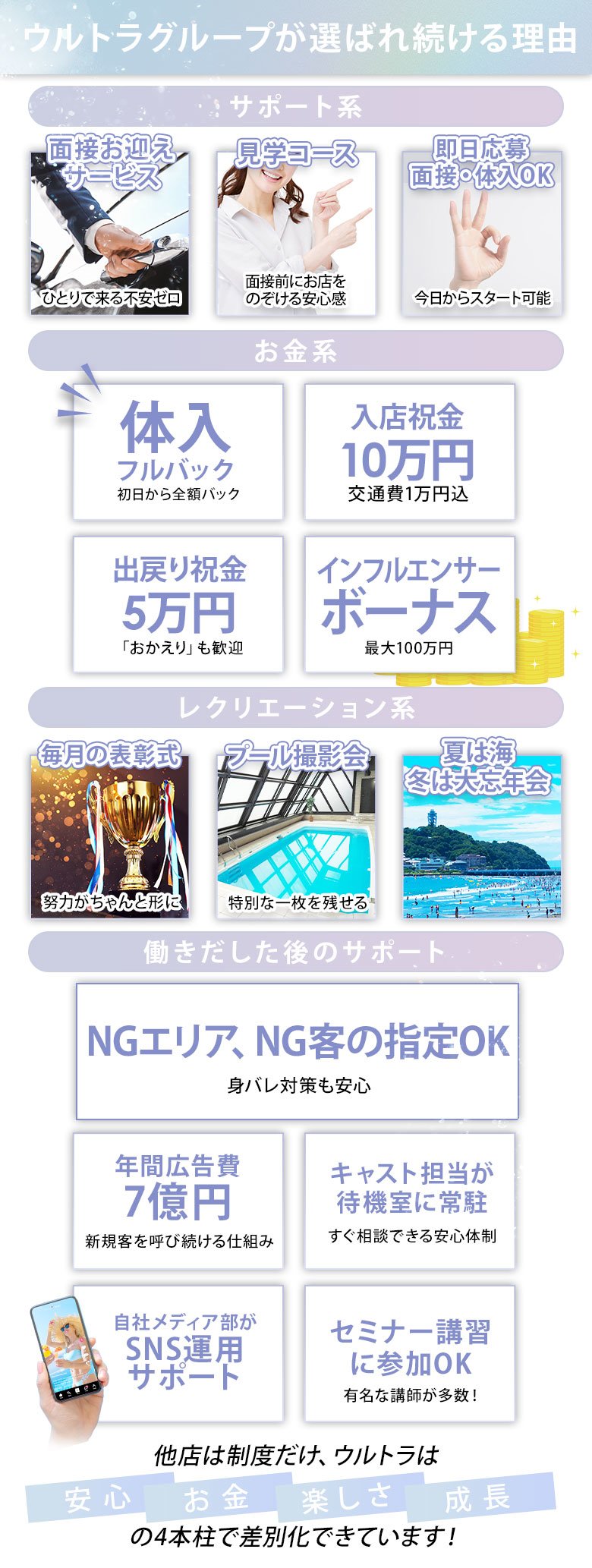 「やってみたいけど勇気が出ない…」そんなあなたを全力で応援します!入店してくれた方全員に【入店祝い金10万円】支給♪全員が対象だから、初日から安心して働けます。経験やブランクは問いません。あなたの新しいスタートを一緒に作りましょう!