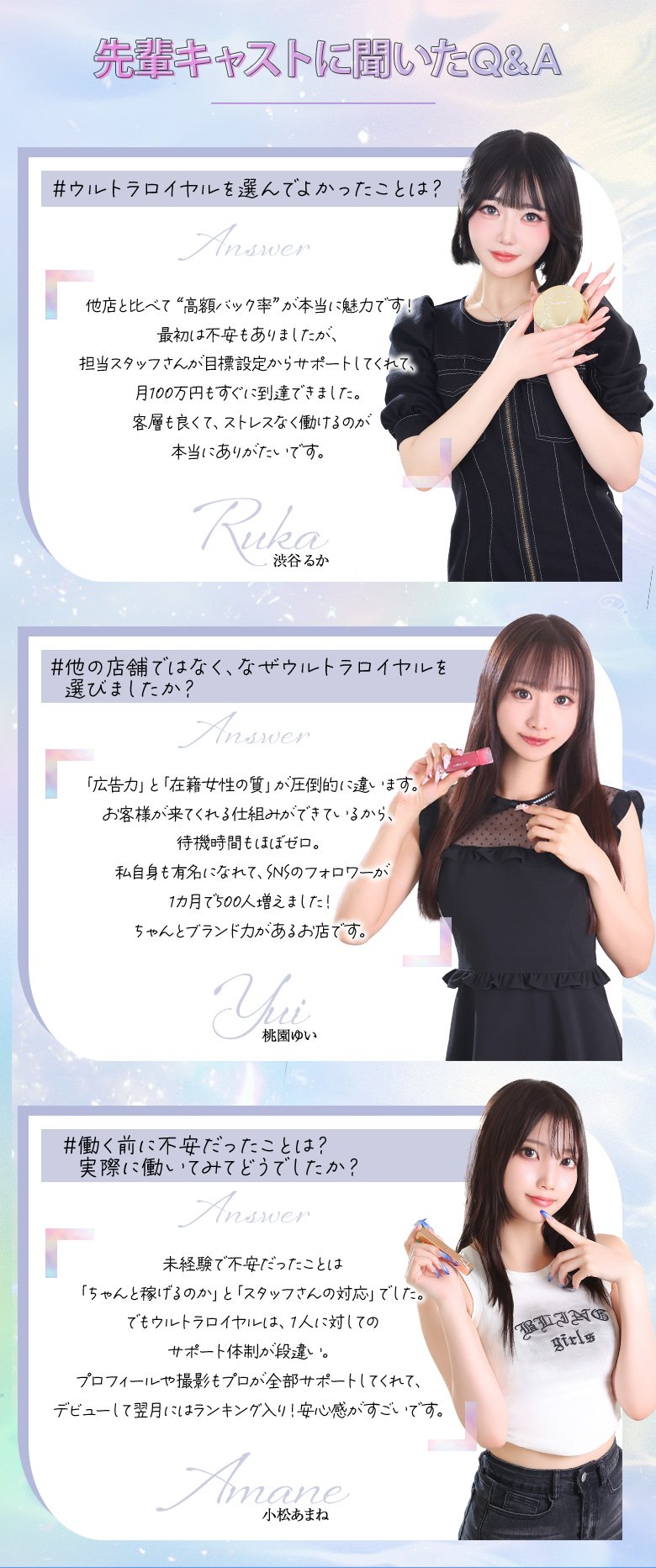 【在籍期間:約1年】【1日勤務:約8時間】【日給:約12万円】【月給:約150万円】【昼職:OL】ウルトラロイヤルに来てから、担当スタッフさんに何でも相談でき、相談も気軽にできてとても働きやすいです✨️おかげで自分の目標だった金額以上にすぐ稼げるようになって、あっという間に貯金もできて嬉しいです🫶今ではもっと上を目指して頑張ろうって思えています🥰これからも頑張ります🔥