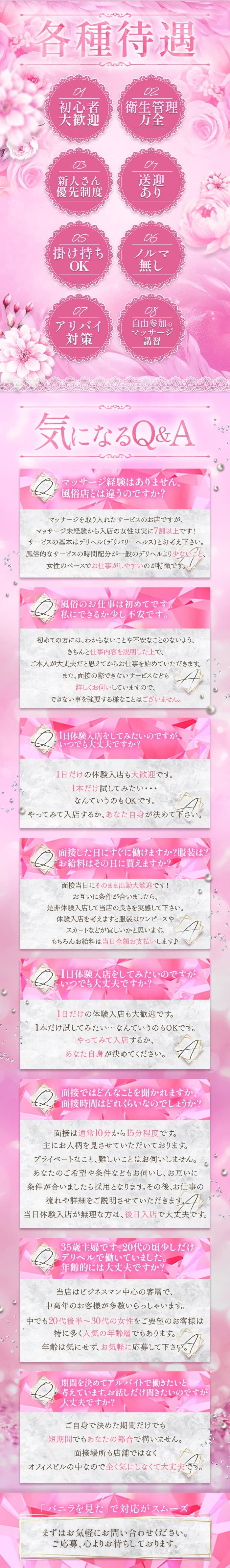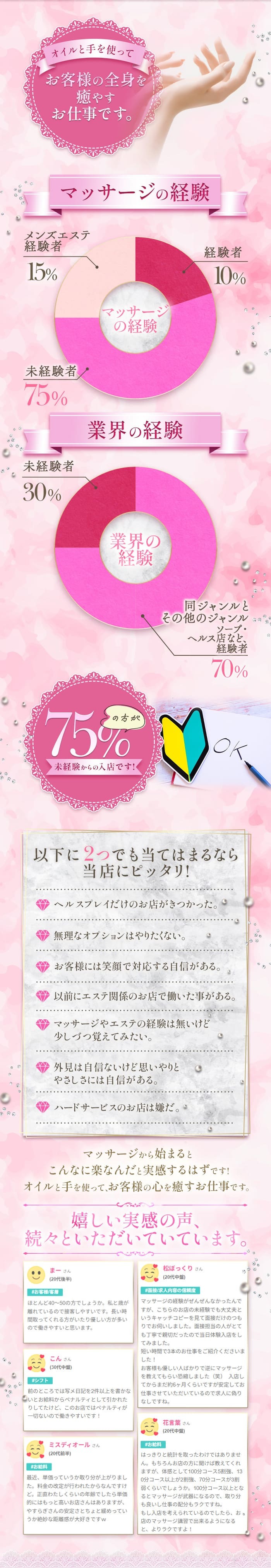A | マッサージ未経験から入店の女性が実は8割以上です! 基本的にはデリヘル(デリバリーヘルス)とお考え下さい。 マッサージを取り入れたサービスなので、風俗的なサービスの時間配分が普通のデリヘルより少ないことと、女性のペースで仕事がしやすいのが特徴です。 最初はヘルスサービスだけでも何も問題ありません。お客様にもしっかりスタッフが説明致します。 マッサージについては、少しずつ・・・くらいな感覚で大丈夫です。 軽いハンドマッサージかオイルマッサージがあります。 そんなに難しく考えなくても大丈夫です、ゆっくりと慣れて下さい。 |