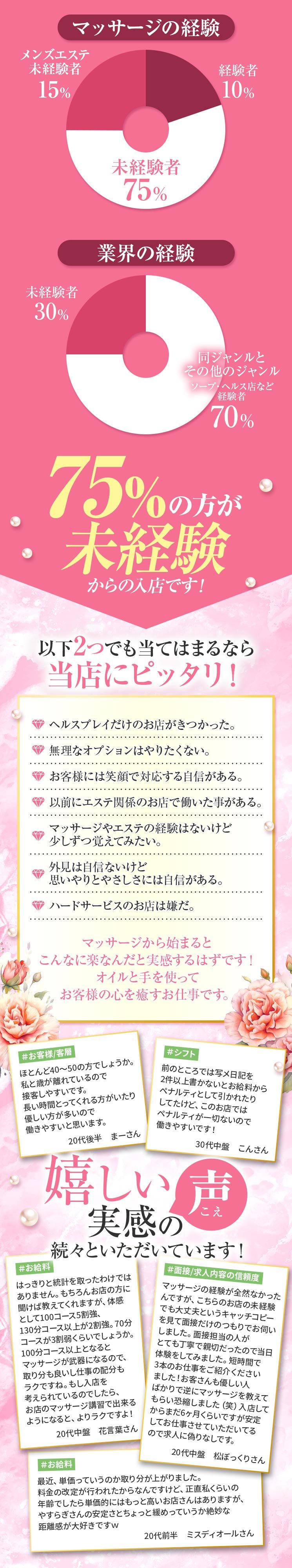 | A | 性的サービスの講習は行いません。 サービス内容や接客マナーについては、口頭で丁寧にご説明します。 講習用の動画もご用意しております。 マッサージについては、未経験者でも対応可能なソフトマッサージやオイルマッサージなので、少しづつ覚えて頂ければ大丈夫です。 しっかりと覚えたい方は、専門の女性講師によるマッサージ講習を自由参加で初級・中級・上級と分けて定期的に行っております。 自由参加ですが、ご自身のスキルアップにもなりますし、 大変人気がある講習ですのでこちらも是非参加してみて下さいね♪ |