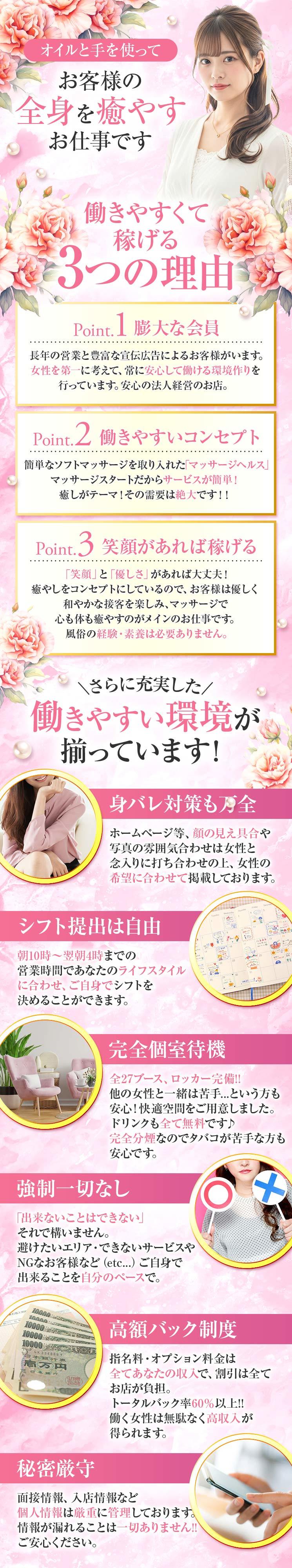 ☆癒やしがテーマの安心して働けるお店です。創業20年の信頼と実績、膨大な顧客数!働きやすくて、しっかり稼げる。室待機、完全分煙、駅から3分のオフィスビルで通勤便利!終業時の送りなど ●当店は女性がストレスなく安心して働ける事、女性がいつでも稼げるお店である事を重点に日々運営しています。
