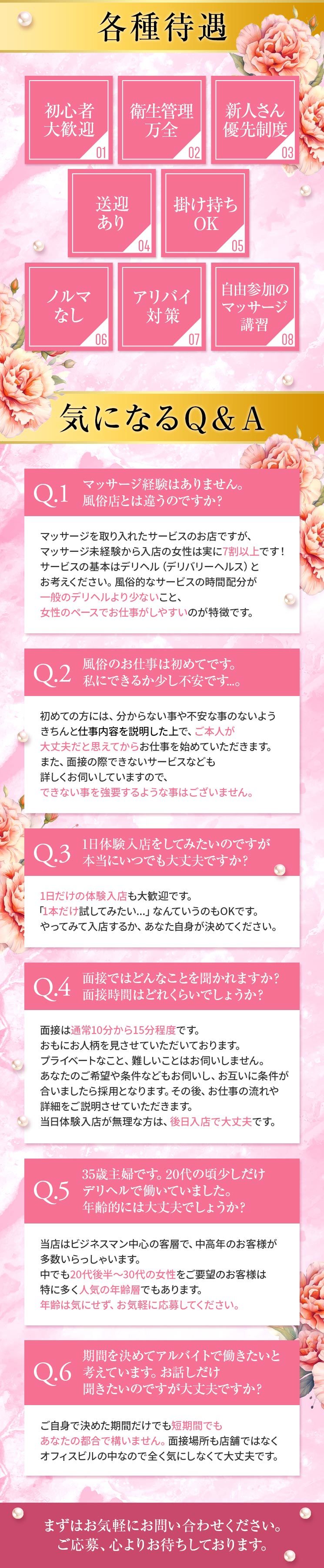 | A | マッサージ未経験から入店の女性が実は8割以上です! 基本的にはデリヘル(デリバリーヘルス)とお考え下さい。 マッサージを取り入れたサービスなので、風俗的なサービスの時間配分が普通のデリヘルより少ないことと、女性のペースで仕事がしやすいのが特徴です。 最初はヘルスサービスだけでも何も問題ありません。お客様にもしっかりスタッフが説明致します。 マッサージについては、少しずつ・・・くらいな感覚で大丈夫です。 軽いハンドマッサージかオイルマッサージがあります。 そんなに難しく考えなくても大丈夫です、ゆっくりと慣れて下さい。 |