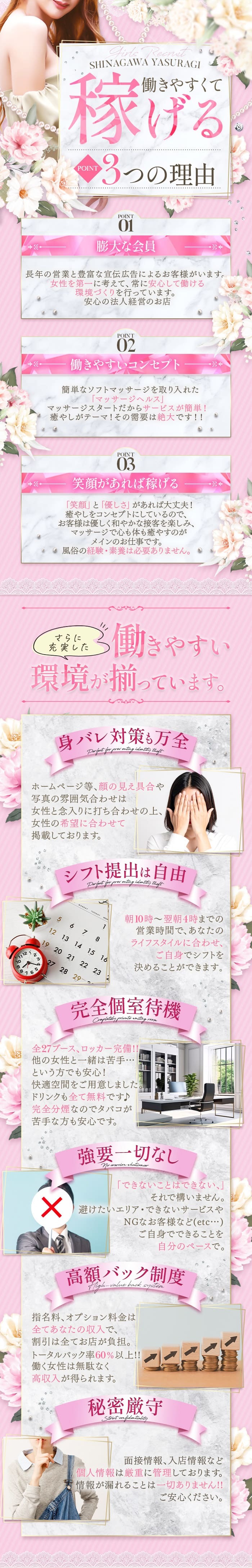 A | 「品川やすらぎ」は癒やしを提供するお店です。 お客様に気遣いや優しさを出せる女性、男性を献身的に癒やし、愛情を込めて接客する女性を求めています。 手馴れた女性よりも、気遣いのできる普通の女性と過ごす時間を望んでいるお客様は意外に多いものですよ。 お客様は貴女の笑顔やさりげない気遣いや仕草に安らぎや癒しを感じてくれます、 普段の貴女らしさを出して下さい、 充分にお客様は満足してくれるはずです。 |
