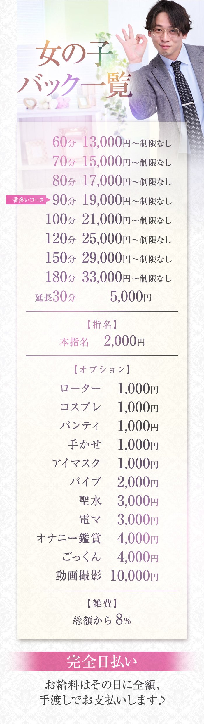 | A | ノルマは一切ありません。 働き方や稼ぐ目標は女の子が自分で決めます。 お店やスタッフはそれを全力でサポートします! |