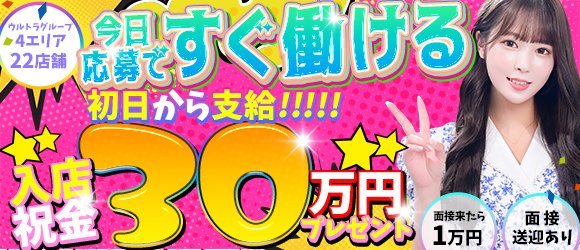 「やってみたいけど勇気が出ない…」そんなあなたを全力で応援します!入店してくれた方全員に【入店祝い金30万円】支給♪全員が対象だから、初日から安心して働けます。経験やブランクは問いません。あなたの新しいスタートを一緒に作りましょう!