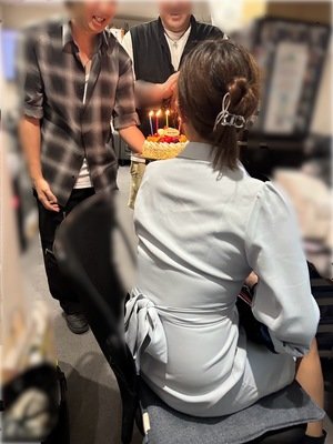 突然、スタッフがケーキを持って集まり、サプライズでお祝い🎂✨