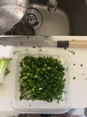 今朝ネギを切ってました。ネギは自分が食べる分なので手抜きで1~2分ぐらいで切りましたが、店で出す時はふわっとした感じを出すために細かく切る事になります。