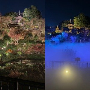 2025年で移築100周年を迎える三重塔は濃紺の空に映え、人工の雲海と光の演出で夜空にオーロラを再現する冬の期間限定イベント、森のオーロラで青く輝く幻想的な姿も、また素敵でした✨️