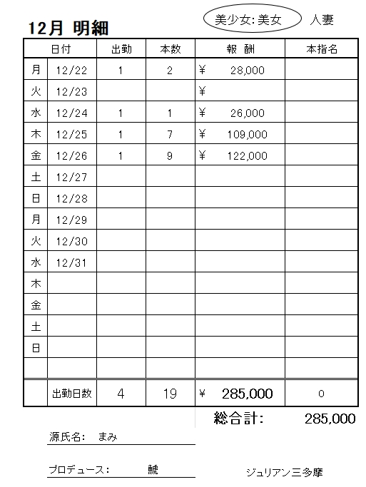 明細は、入店から3か月が経過した《まみちゃん》。