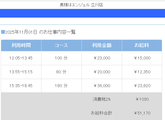 ※本日11/1(土)12:00~17:00 7時間待機のキャスト様のお給料明細です♪
