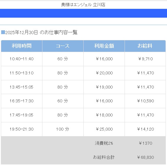 ※本日12/30(火)10:00-22:00出勤のキャスト様のお給料♪