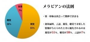 メラビアンの法則というものがあって、第一印象の内訳が「視覚情報」が55%、聴覚情報が38%、話の内容が7%という結果が出ています!